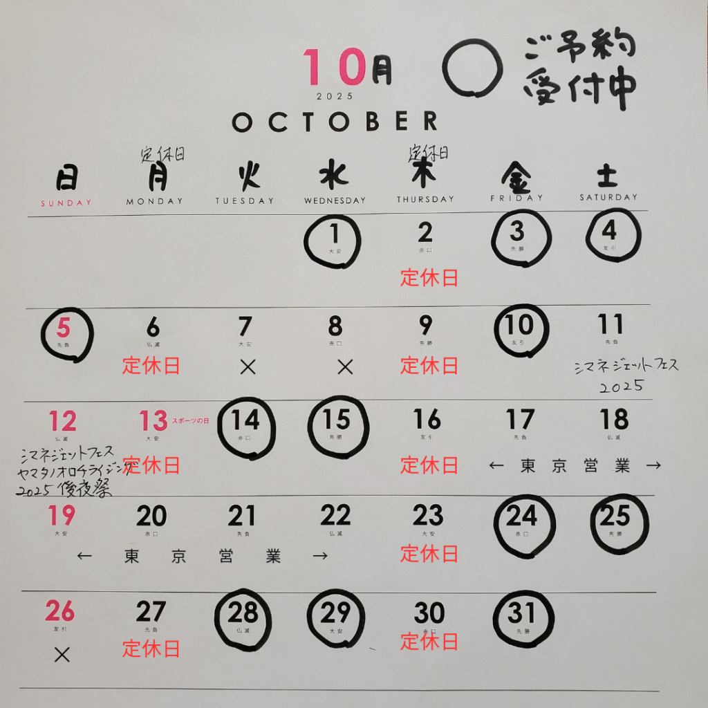 11月1日(土)~12日(水)東京出張/玉造予約不可
